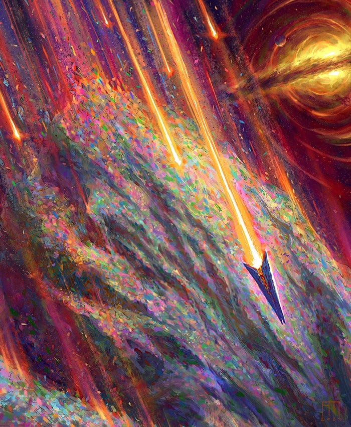 Although the set’s prerelease hasn’t begun at the time of writing, I’ve nonetheless been utterly entranced during the month of July. The art: amazing! The mechanics: cool, I think! The aforementioned story: gobsmacking. The worldbuilding: monumentally great. If Tarkir: Dragonstorm both returned to and revitalized the roots of Magic worldbuilding, Edge of Eternities has helped it grow in amazing new directions.