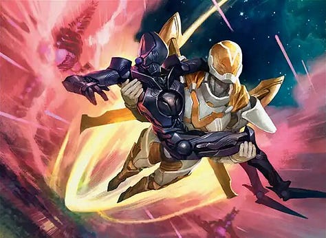 The brilliance of Edge of Eternities is to adapt this subtext and integrate it into the text itself. From the player’s perspective, we enter into a world that might look like the far future of a plane like Dominaria—but the characters, factions, and cards grapple over and over with the question of time itself.